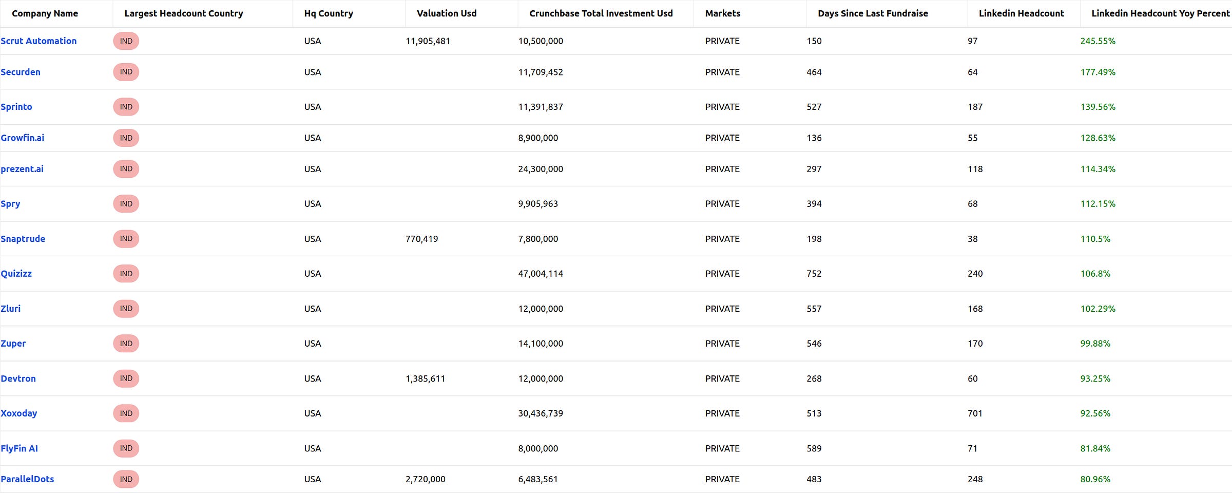 CSV has 31 columns with headcount growth metrics, firmographics and founder details.